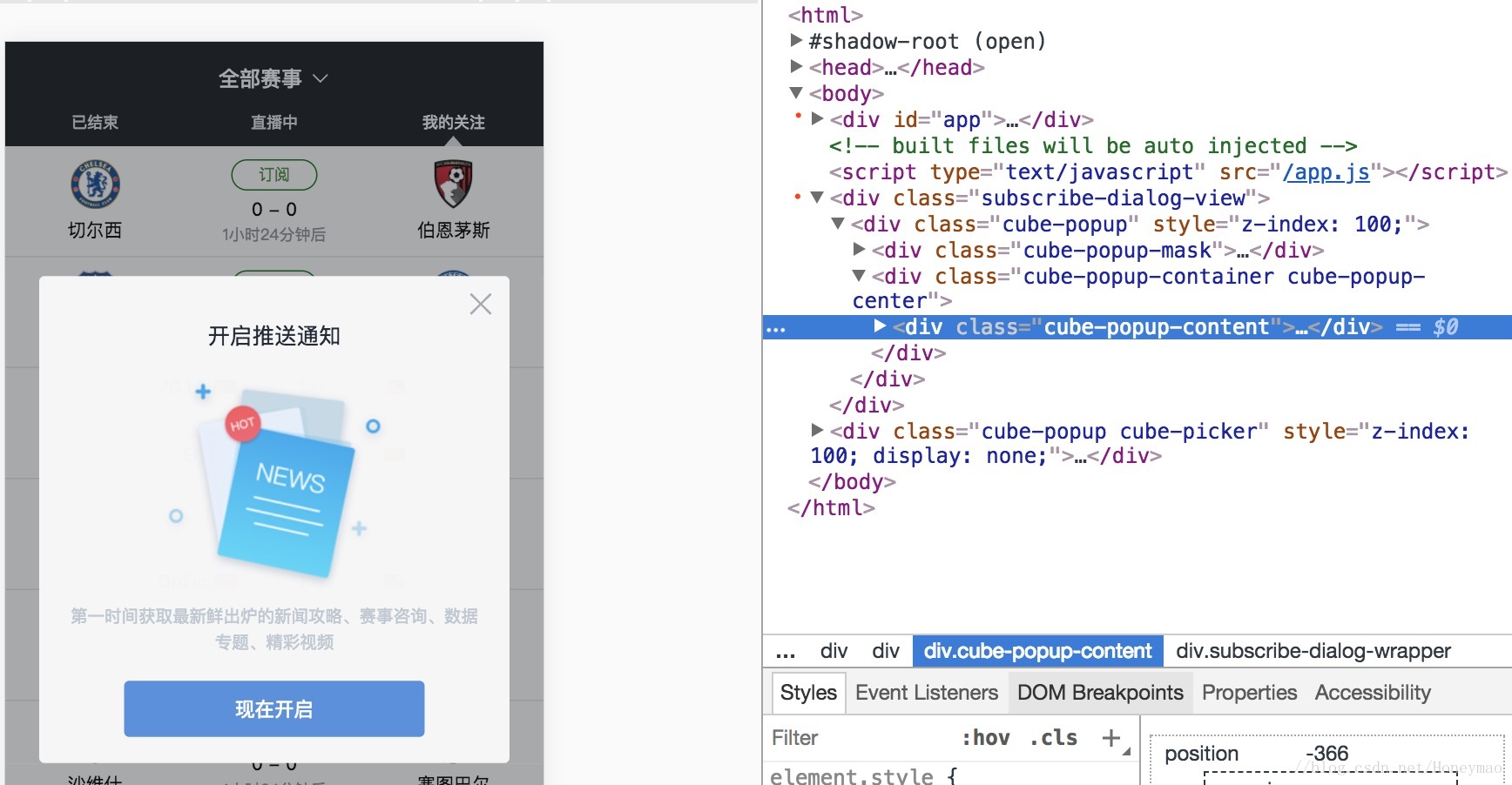我们需要在用户点击订阅后,为用户弹一个开启订阅的弹窗。因为样子比较花,哈哈,所以我们可以基于 cube-ui 的 Popup 封装一个。这也是 cube-ui 为我们提供的一个很好的功能。那这里,就不得不先说一下,cube-ui 的另一个是非重要的 API了。