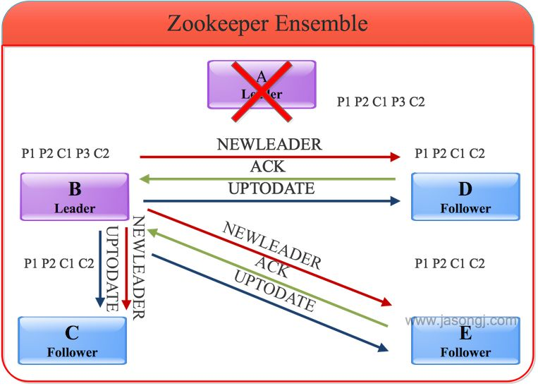 选出新leader:旧Leader也即A宕机后,其它节点根据上述FastLeaderElection算法选出B作为新的Leader。C、D和E成为Follower且以B为Leader后,会主动将自己最大的zxid发送给B,B会将Follower的zxid与自身zxid间的所有被Commit过的消息同步给Follower,如下图所示。