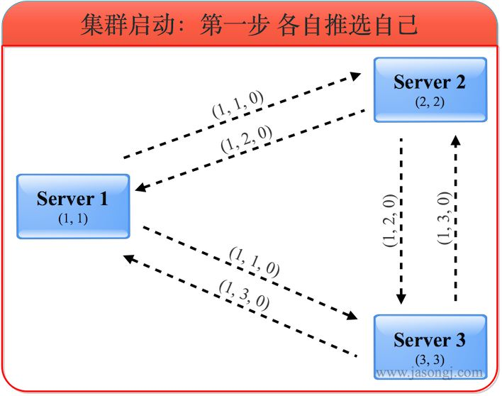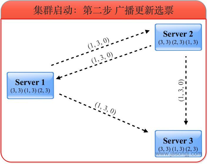 发送初始化选票:每个节点开始都是通过广播把票投给自己,初始化投票投的都是自己。如节点1的vote_id就是self_id,vote_zixd都是self_zxid。