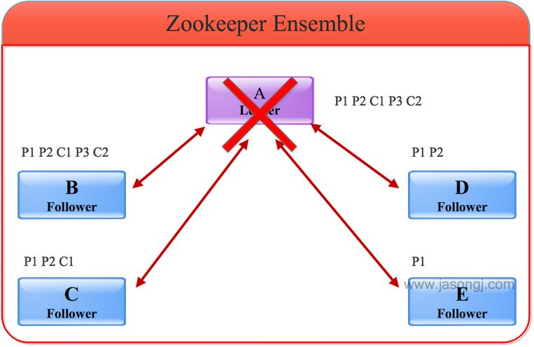 FailOver前状态:为更好演示leader failover过程,为更好演示Leader Failover过程,本例中共使用5个ZooKeeper节点。A作为Leader,共收到P1、P2、P3三条消息,并且Commit了1和2,且总体顺序为P1、P2、C1、P3、C2。根据顺序性原则,其它Follower收到的消息的顺序肯定与之相同。其中B与A完全同步,C收到P1、P2、C1,D收到P1、P2,E收到P1,如下图所示。