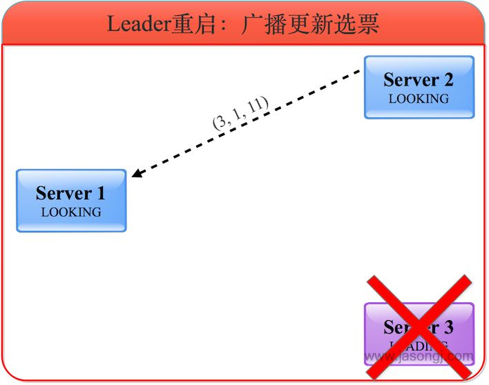 Follower发起新投票:leader(节点3)宕机后,follower(节点1,节点2)长时间没有收到心跳连接的请求后,知道leader宕掉了,因此进入looking状态,发起新一轮的投票,并且都将票投给自己