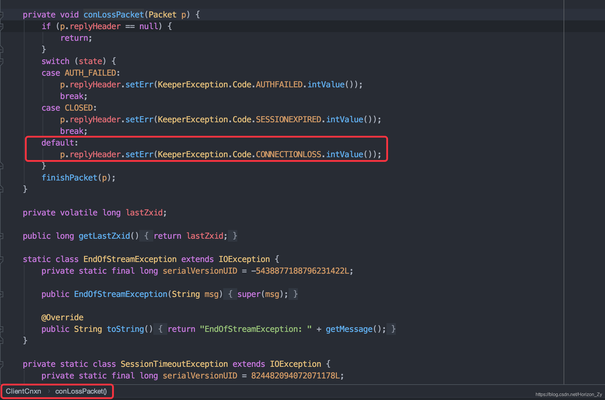 收到服务端的数据的length大于默认的1024 * 4096就是4M。抛出异常,在外面catch住,然后就走cleanup();的代码逻辑。对pendingQueue中的packet设置为ConnectionLoss异常。最终导致该异常。