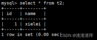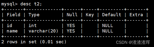 create table t2 (id int, name varchar(20)); //varchar字符类型,20字符长度