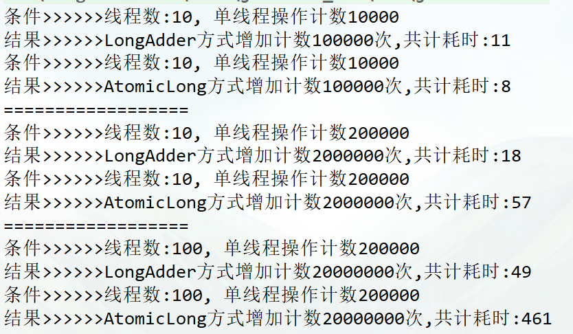 System.out.println("结果>>>>>>LongAdder方式增加计数" + (threadCount * times) + "次,共计耗时:" + end);