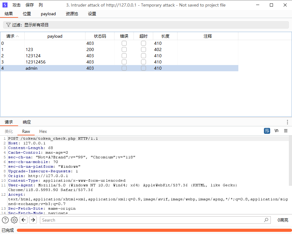 然后可以看到结果,这里虽然最后的密码是正确的,但是因为token没有发生改变,所以还是返回了403