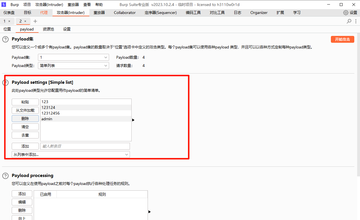 然后在这里添加密码,其中有一个是正确密码,然后点击开始攻击