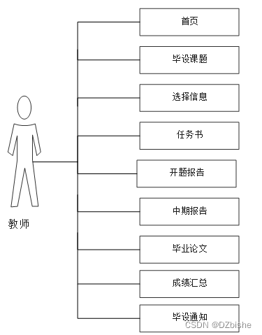 教师注册登录后可进行首页、毕设课题、选择信息、任务书、开题报告、中期报告、毕业论文、毕设通知、成绩汇总管理,教师用例如图3-3所示。