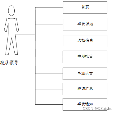 院系领导注册登录后可进行首页、毕设课题、开题报告、中期报告、毕业论文、答辩通知、毕设通知、成绩汇总管理,院系领导用例如图3-4所示。