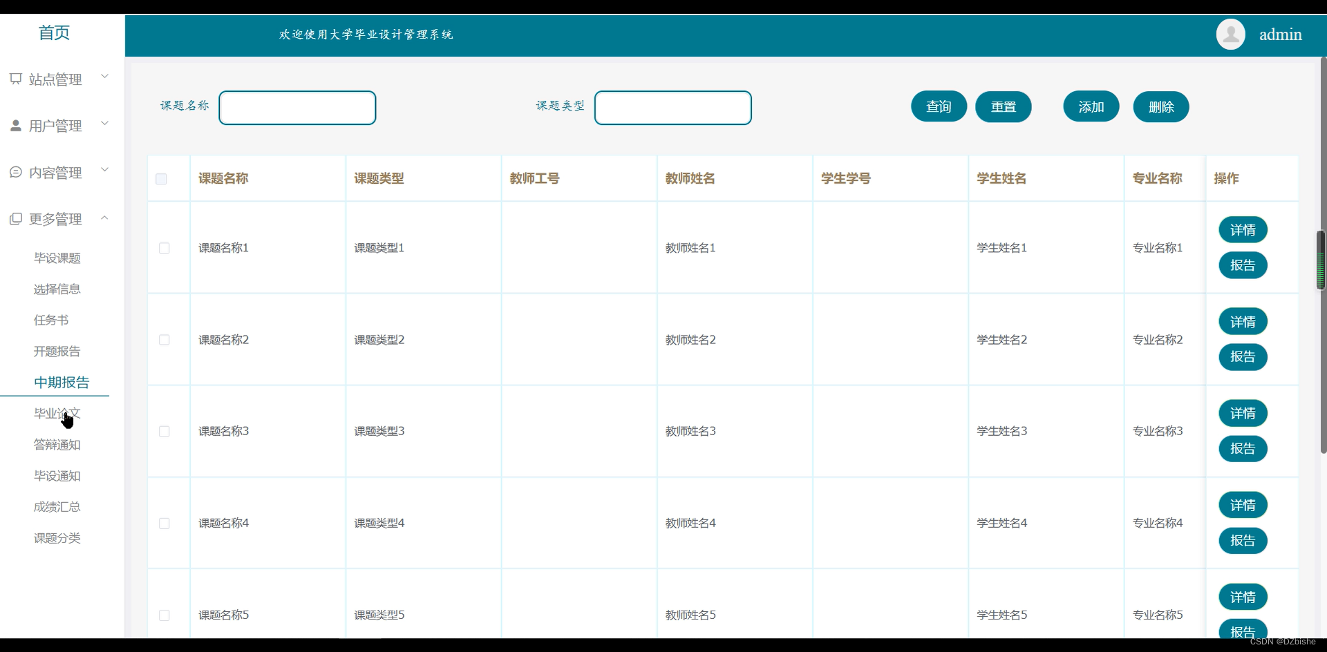 毕设课题:通过列表可以获取课题名称、课题类型、教师工号、教师姓名等信息,进行删除或修改操作,如图5-7所示。