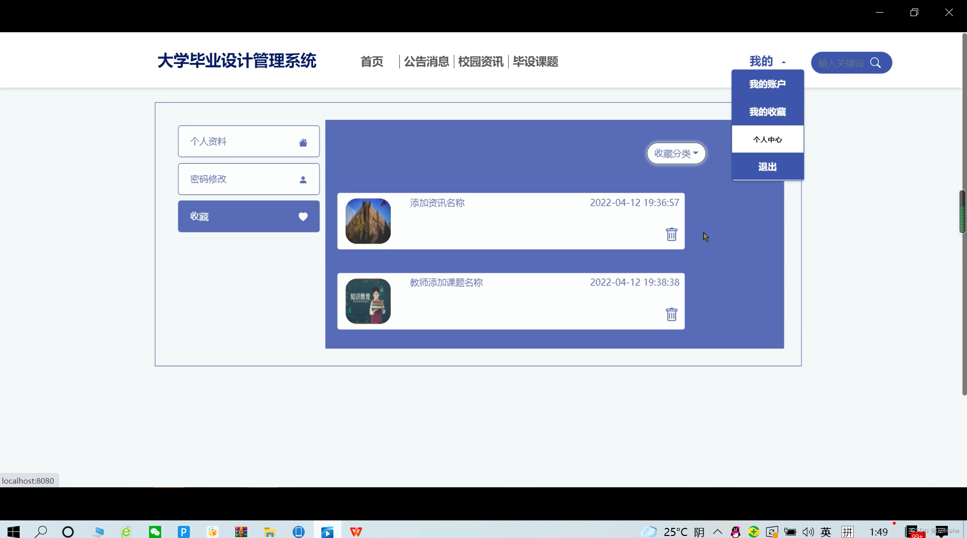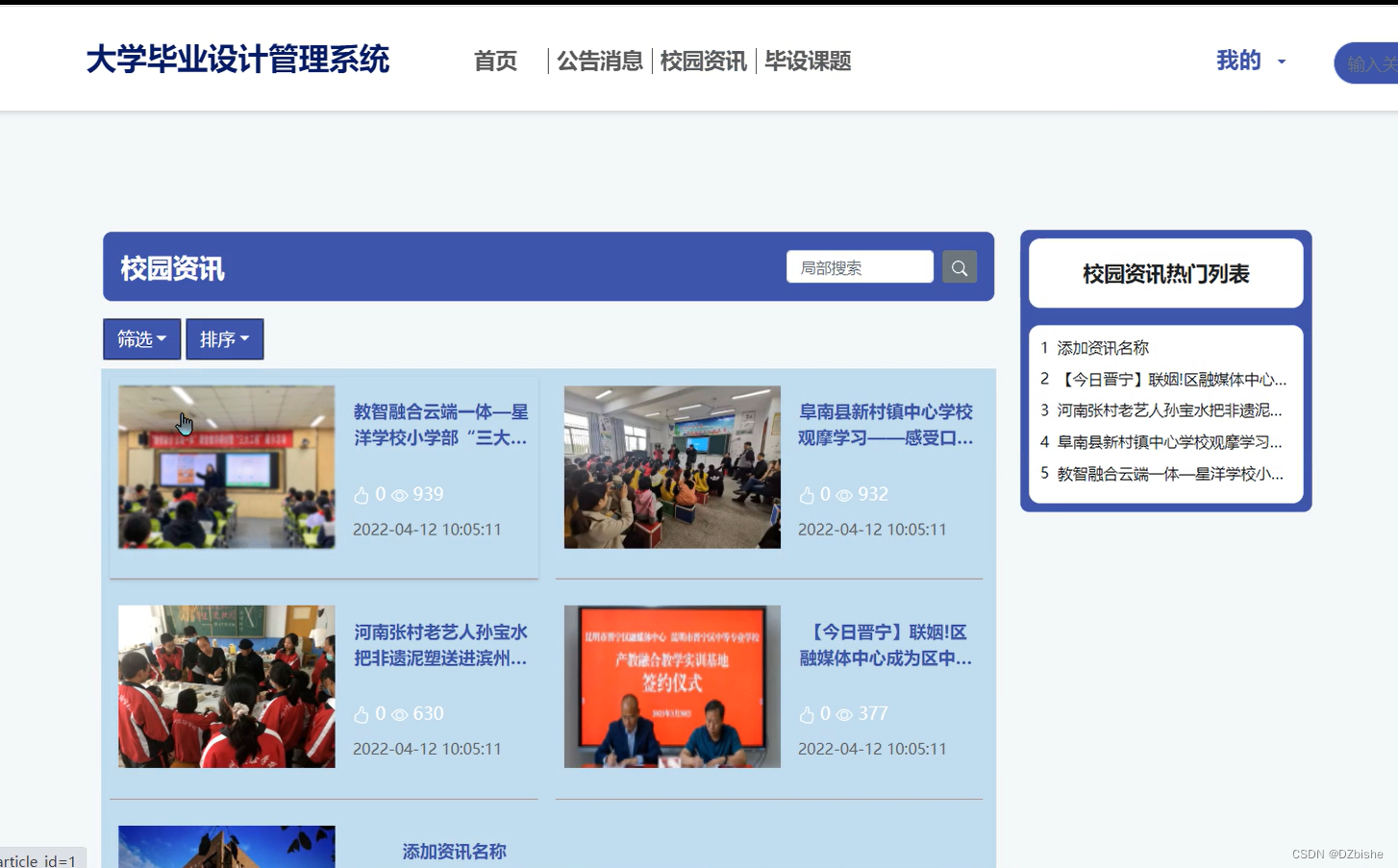 模块包括主界面,首页、公告消息、校园资讯、毕设课题等进行相应的操作。