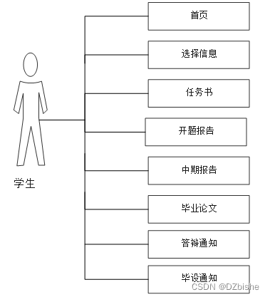 学生注册登录后可进行首页、选择信息、任务书、开题报告、中期报告、毕业论文、答辩通知、毕设通知管理,学生用例如图3-2所示。