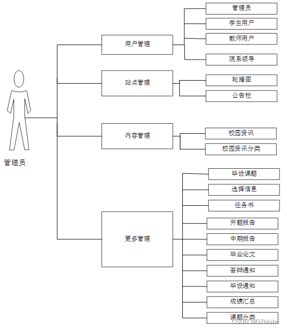 管理员登录后可进行首页、首页、站点管理(轮播图、公告栏)用户管理(管理员、学生用户、教师用户、院系领导)内容管理(校园资讯、校园资讯分类)更多管理(毕设课题、选择信息、任务书、开题报告、中期报告、毕业论文、答辩通知、毕设通知、成绩汇总、课题分类),管理员的用例如图3-1所示。