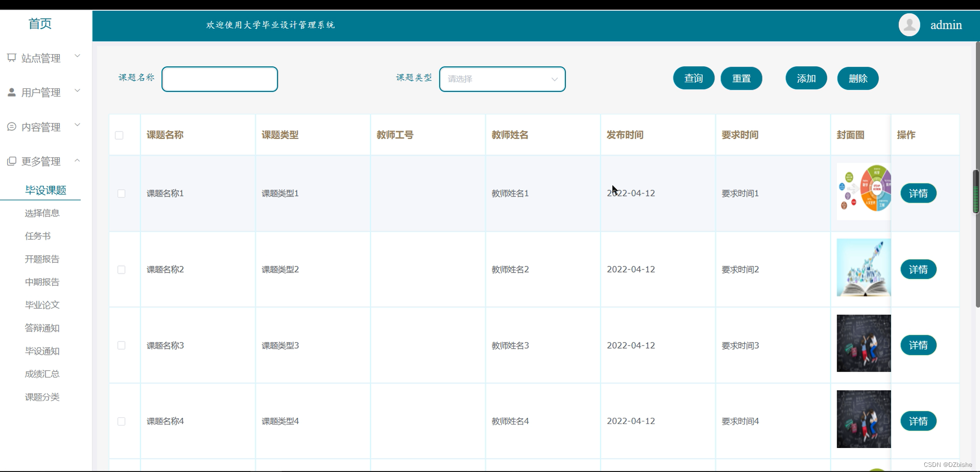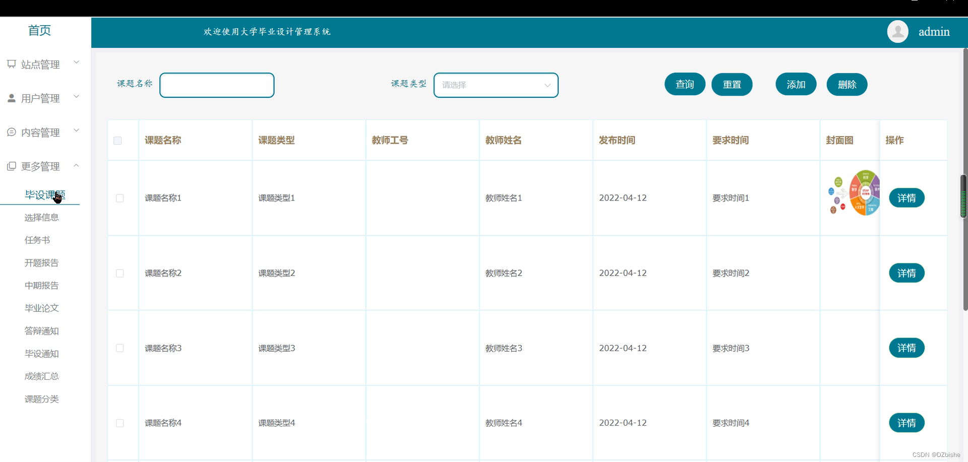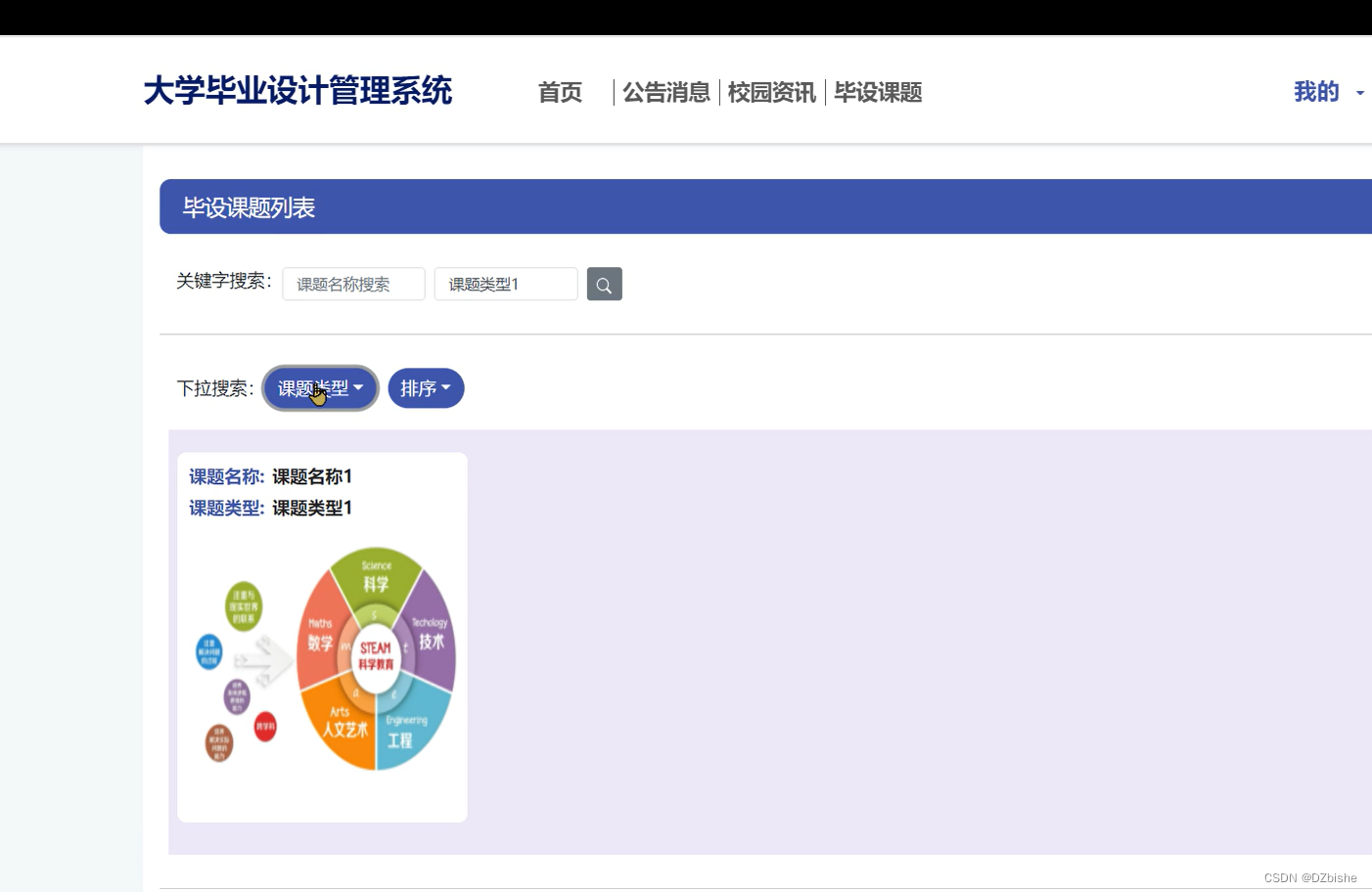 毕设课题列表管理:毕设课题列表页面可查看课题名称、课题类型、图片等信息如图5-3所示。