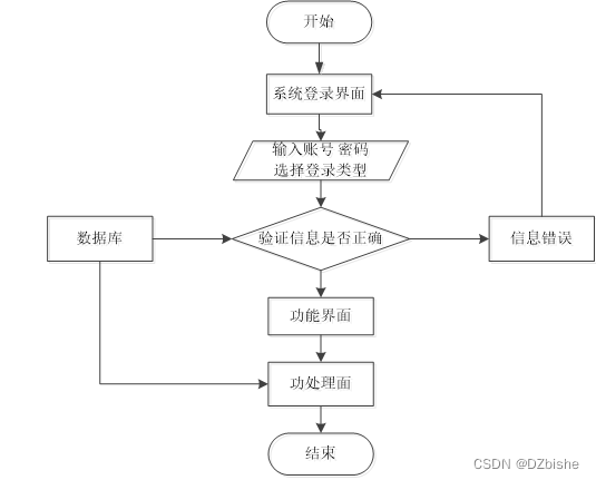 用户想进入系统,首先进入系统登录界面,通过正确的用户名、密码,选择登录类型登录,系统会检查登录信息,信息正确,然后输入相应的功能界面,提示信息错误,登录失败。系统操作流程如图3-4所示。