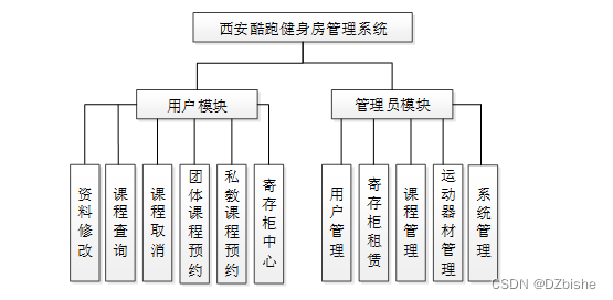 根据用户对系统的需求,要求系统简单操作,能够准确,完整的对信息进行管理。西安酷跑健身房管理系统在对需求做解析后,整个系统主要分为两个部分:管理员和普通用户,每个模块下的分支功能不一样。对功能做出如下说明: