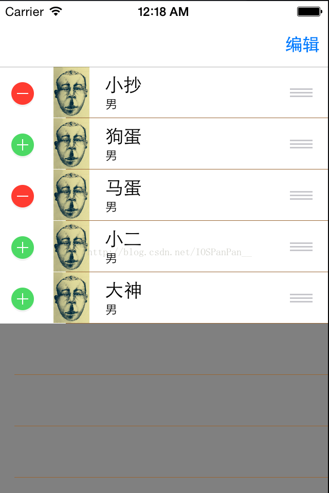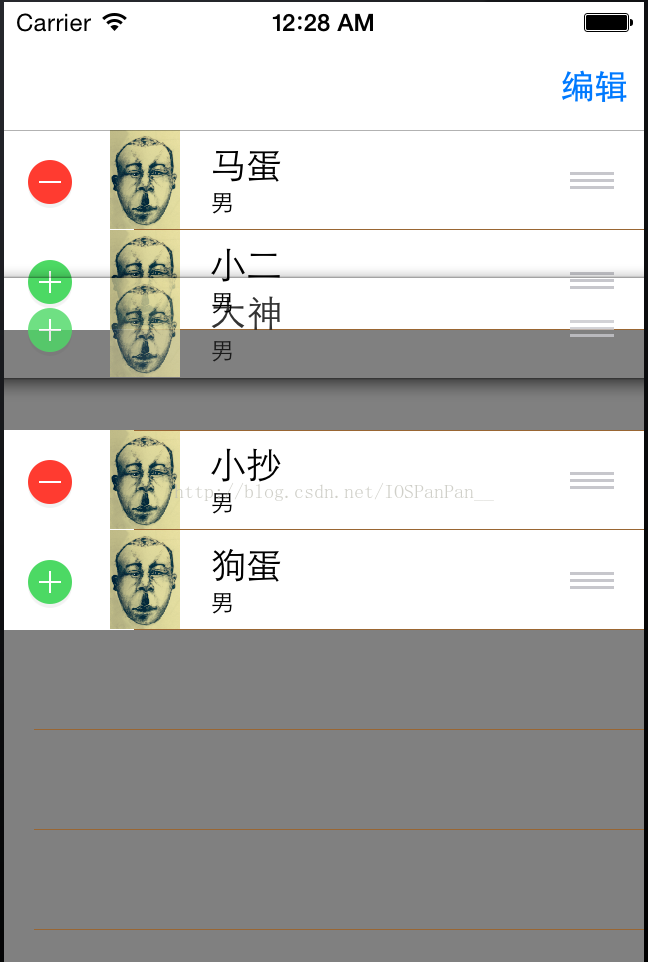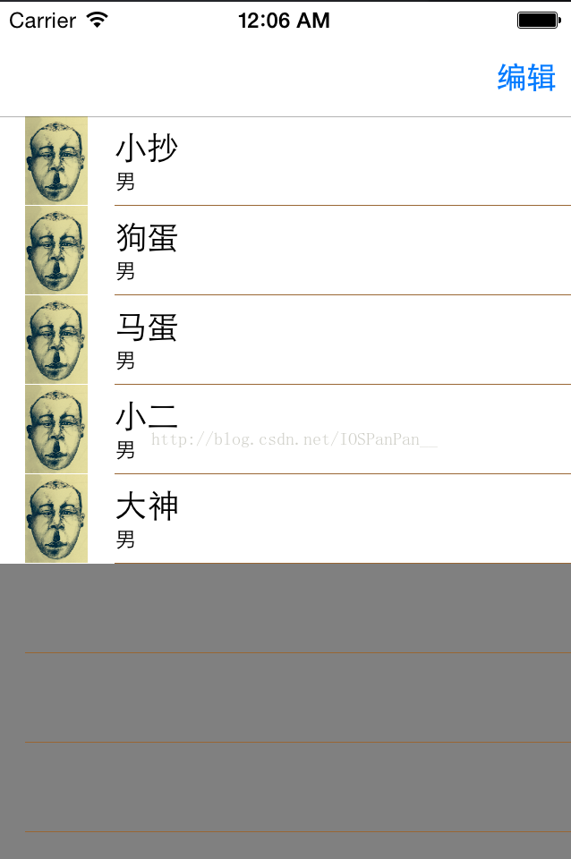 我们可以看见右上角有编辑两个字,其实,它是一个按钮,它的作用是编辑对下面人员的增减的,也就是UITableViewCell中的内容进行设计,修改每一行,及row的内容;实现它的代码是: