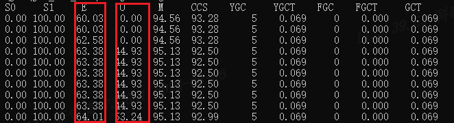 2、jstat命令:jstat命令可以用来统计Java应用程序的各种性能指标,jstat -gcutil 是非常常用的监控垃圾回收情况的命令。jstat -gcutil可以看出新生代,老年代的占用变化,以及新生代,老年代发生了多少次垃圾收集等情况,用于为内存分析提供数据支持。如下图所示,E和O列分别代表新生代中的Eden区和老年代Old区,YGC代表当前发生过的MinorGC次数,FGC代表当前发生过的FullGC的次数。