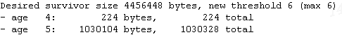 4、还有其他一些java提供的性能分析工具,包括java提供的VisualVM,jmc等可视化的监控分析工具,大家可参考相关使用手册。同时通过在jvm参数中增加相关的gc日志的详细细节也可以得到有用的一些信息,比如在启动参数中使用-XX:+PrintTenuringDistribution 可以打印出显示新生代survior中对象年龄段晋升分布,当超过晋升阈值时就会被提升到老年代。如下图所示,表示在survior中的对象年龄分布包含了有4、5两种年龄的对象所占有的对象空间,new threshold为6 就是根据垃圾回收动态的判断,对象超过6就要晋升到老年代,晋升年代的降低可以尽量减少在新生代不断的复制对象,不过也会加快老年代内存的增长。