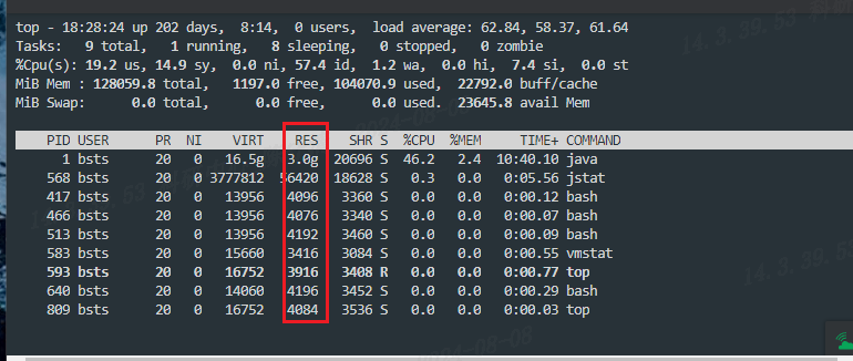 1、top命令:top命令可以在Linux系统中显示当前系统中各个进程的CPU、内存、I/O等资源消耗状况。其中,“RES”列表示进程使用的物理内存大小,这个值真实反应进程所占用内存,输入M会按照内存大小排序。如下图所示为容器中的top结果,可以看到1号进程占用的内存最多,res常驻内存为3g。