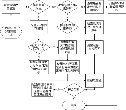 上述流程中,当发现内存占用异常时,需要查看垃圾收集情况,垃圾收集具体情况可以通过打印gc日志来直接通过文件,也可以通过用jstat -gcutil 命令直观动态来查看其情况。首先判断是否存在fullgc,如果存在则检查下java堆最大值的设置是否远大于fullgc后的内存大小,如果不是,则说明堆的设置可能过小,将其调整为fullgc之后至少4倍以上的堆空间后再进行测试。如果堆大小设置满足,则检查是否有大对象创建或频繁创建对象的情况,一般这种情况下需要使用jmap -dump:format=b,file=命令间隔打印多个堆快照,使用MAT等内存分析工具进行比对分析是否有内存泄露或常驻内存对象的情况。如果不存在fullgc的情况,则需要查看是否存在gc时长异常的情况,如果有,则查看是否由于系统态与用户态时间的对比检查是否存在页交换等情况,如果没有则排查是否有堆外内存异常情况。