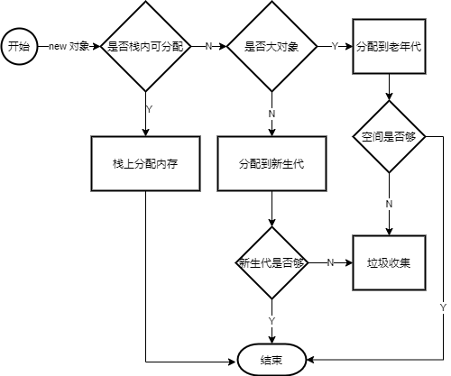 在方法执行过程中使用到的对象是从堆中引用,如果在执行过程中产生需要新创建对象,分析如果是会发生逃逸的对象(对象逃逸是指在对象创建后,其引用被传递到其他方法或线程中,导致该对象在方法或线程外部可见)则会在堆中创建,如果对象大小可控并且只在方法内部使用,则可以直接放在栈区中分配内存。在堆中为对象分配内存还需要判断对象是否能在新生代分配,如果新生代没有空间分配则会进行一系列的判断,有可能直接进入老年代,也有可能发生垃圾收集。如下图所示:
