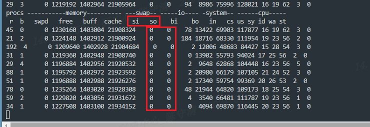 如下图所示,分为memory,swap,io,system,cpu等几大专项,下面一行中的si和so就是对应的虚拟内存页交换情况。