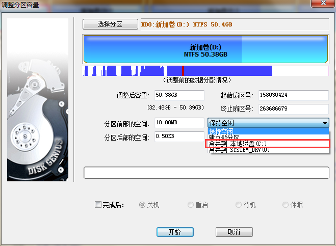 3输入想从d盘(不一定要与c盘相邻,其他盘都行)移到c盘的容量(这里移动10MB),然后鼠标移动到”调整前的数据分配”,“保持空闲”出现下拉选框