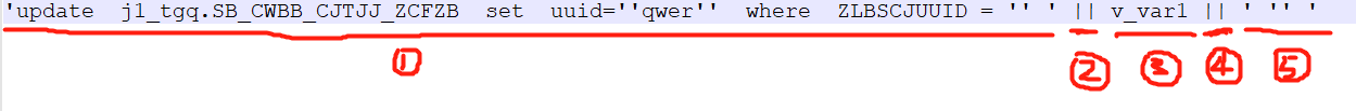 'update j1_tgq.SB_CWBB_CJTJJ_ZCFZB set uuid=''qwer'' where ZLBSCJUUID = '' ' ||v_var1|| ' '' ' 可以分成五部分,如下图.