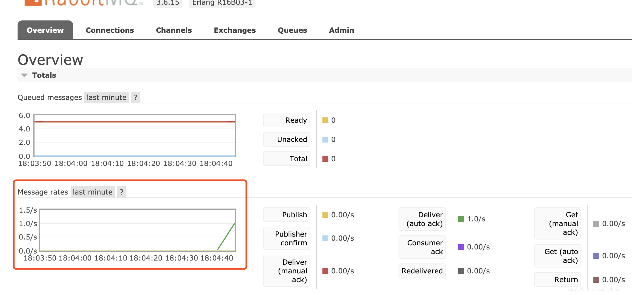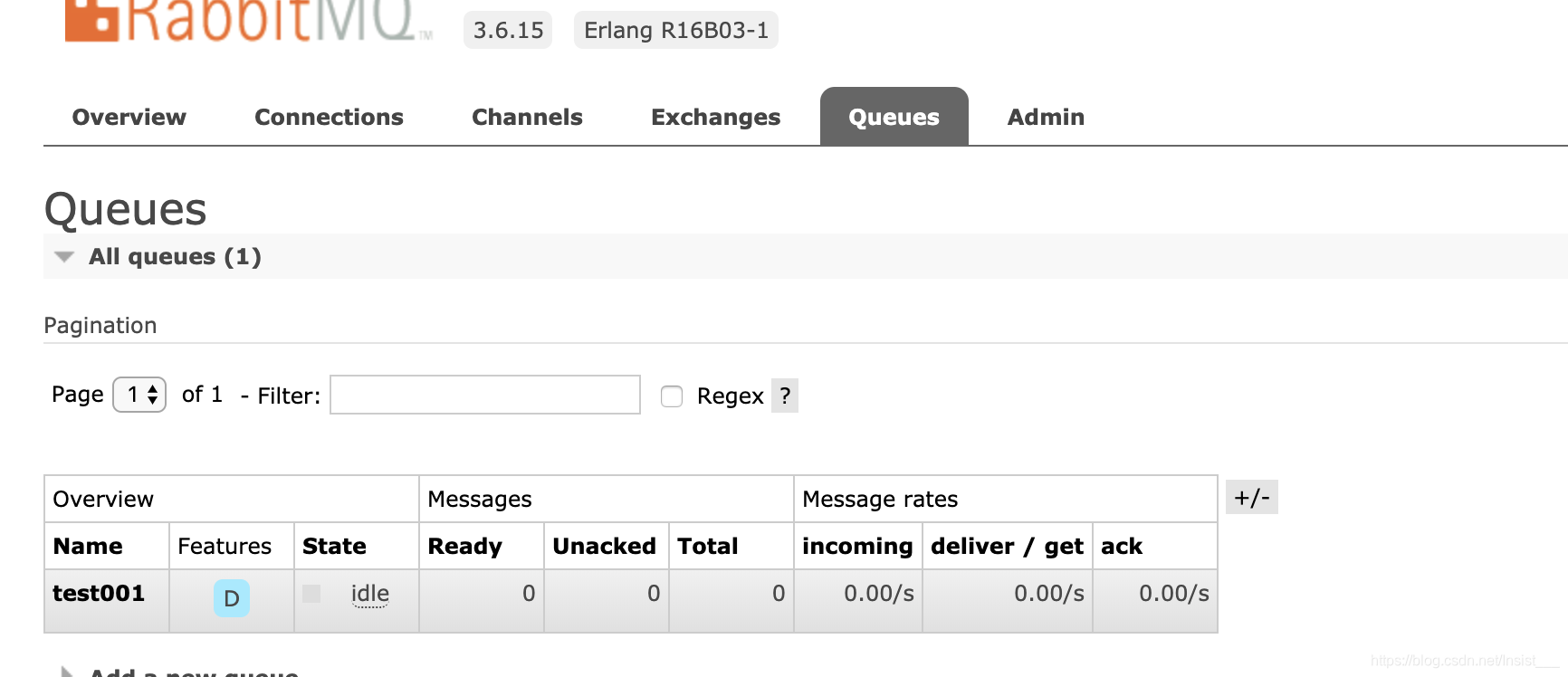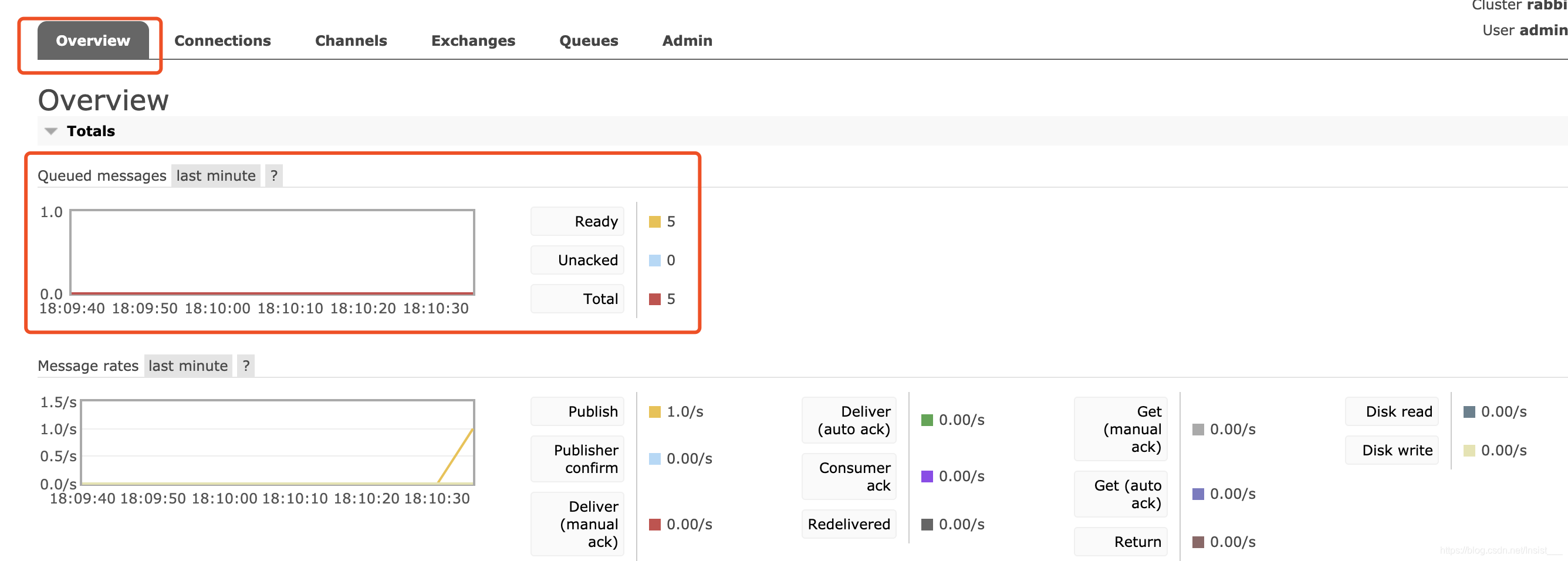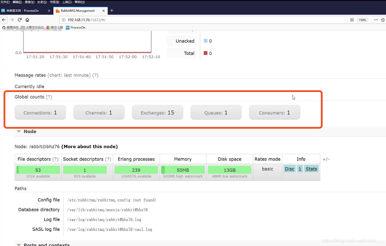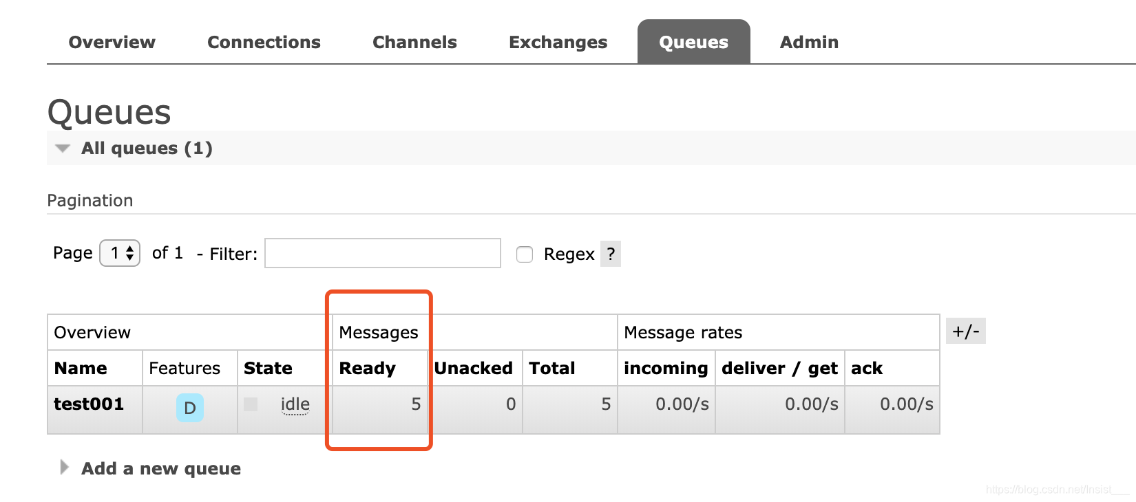有5条消息在队列中存储,但是还没有被消费