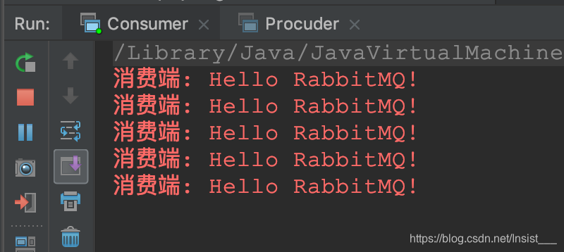 代码中,消费者的控制台也打印啦消费到的消息
