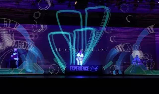 明明是一场科技秀,却偏偏选择了艺术主题作为开场!率先登场的Yago De Quay是一位艺术家兼多媒体研究者,他表演了操作可以响应一系列高精度手势与手指动作的虚拟音乐盒,这些手势可转化为数字声音和音乐,用于控制舞台上各种灯光投影效果。这一表演的精髓在于采用了多个英特尔实感技术摄像头,能够精确追踪手势与手指动作。一场没有乐队的演奏,Yago却单凭一个人的虚拟创作却令全场气氛爆棚。