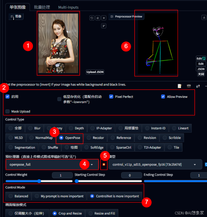 选择预处理器模型“openpose_full”,右侧自动出现模型完整名词。