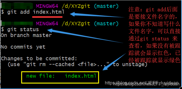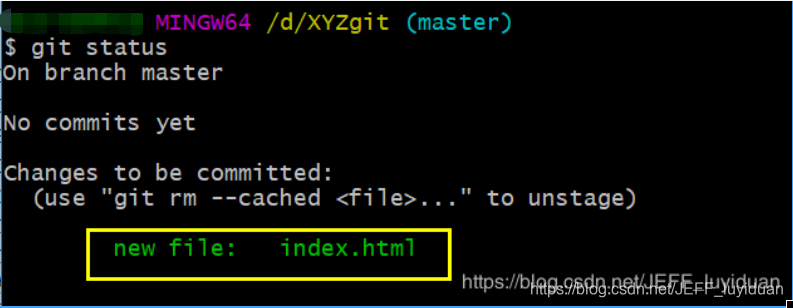 git add:提交到暂存区(提交成功后,我们可以通过git status 来看一下当前文件夹的状态,如果下面这样就是成功的)