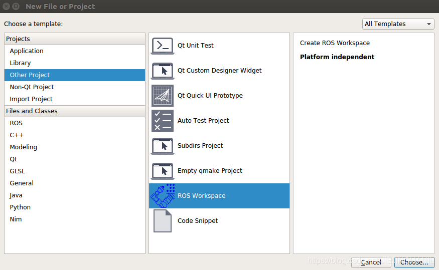 (3)在qt_ros界面中,选择File->New File or Project...->Other Project->ROS Workspace,点击choose,如下图所示: