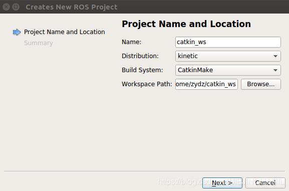 (4) Name处填写工程名,这里取catkin_ws;Distribution和Build System默认不变;Workspace Path选择Browse,选中已有的工程catkin_ws,点击choose,如下图所示: