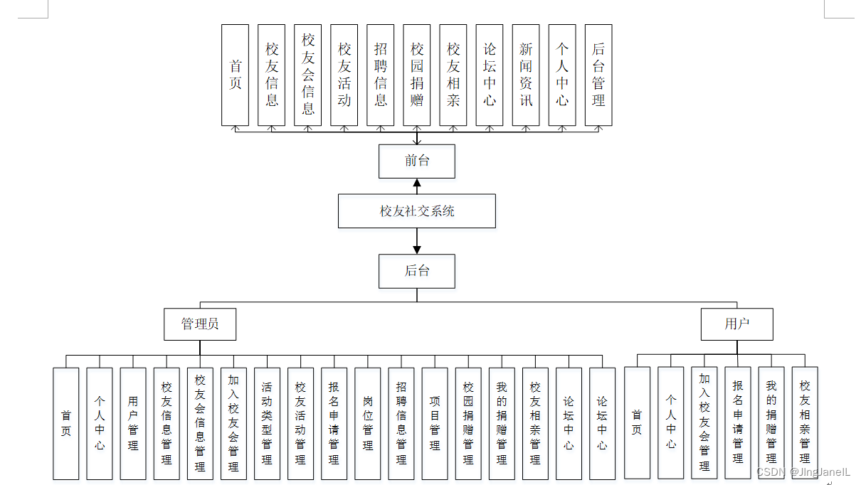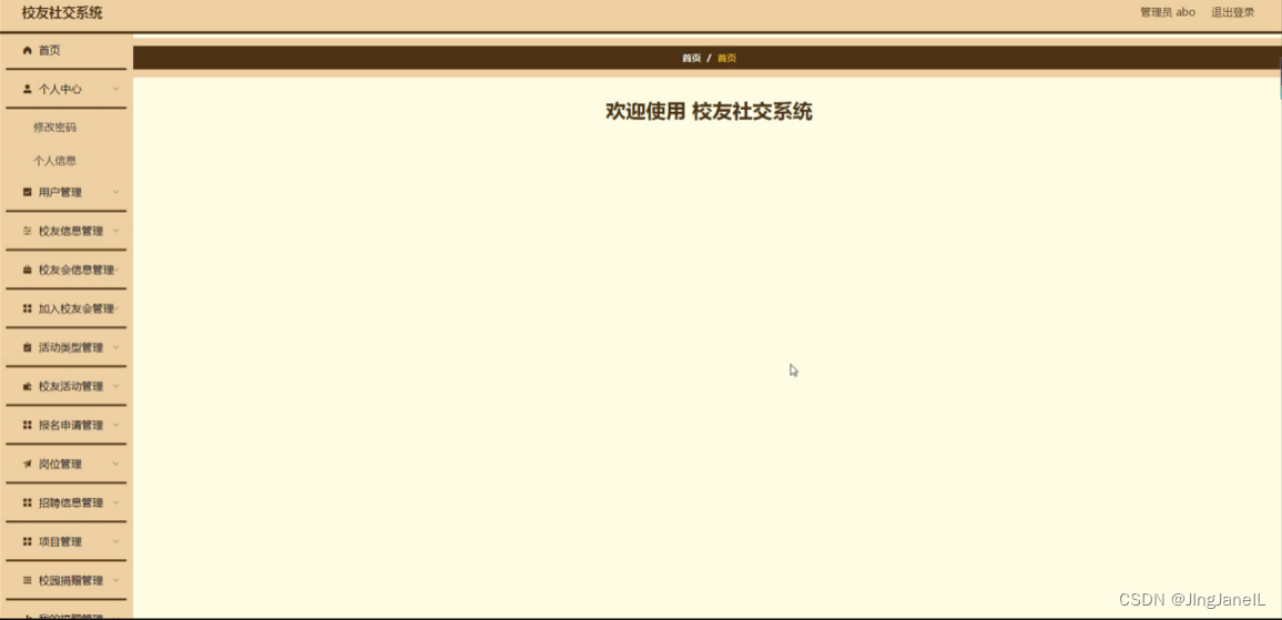 校友社交系统提供给用户一个校友社交信息管理的网站,最新的校友社交信息让用户及时了解校友社交动向,完成校友社交的同时,还能通过论坛中心进行互动更方便。本系统采用了B/S体系的结构,使用了java技术以及MYSQL作为后台数据库进行开发。系统主要分为系统管理员和用户两个部分,系统管理员主要包括首页、个人中心、用户管理、校友信息管理、校友会信息管理、加入校友会管理、活动类型管理、校友活动管理、报名申请管理、岗位管理、招聘信息管理、项目管理、校园捐赠管理、我的捐赠管理、校友相亲管理、论坛中心、系统管理;基本上实现了整个校友社交系统信息管理的过程。