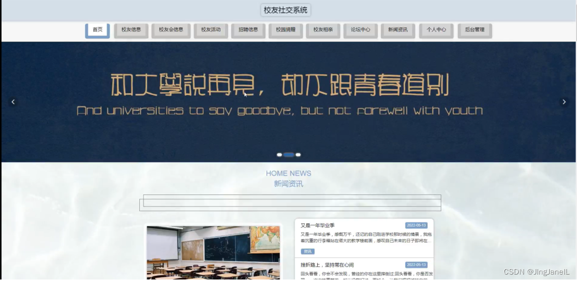 校友社交系统,在系统首页可以查看首页、校友信息、校友会信息、校友活动、招聘信息、校园捐赠、校友相亲、论坛中心、新闻资讯、个人中心、后台管理等内容进行详细操作,如图5-1所示。
