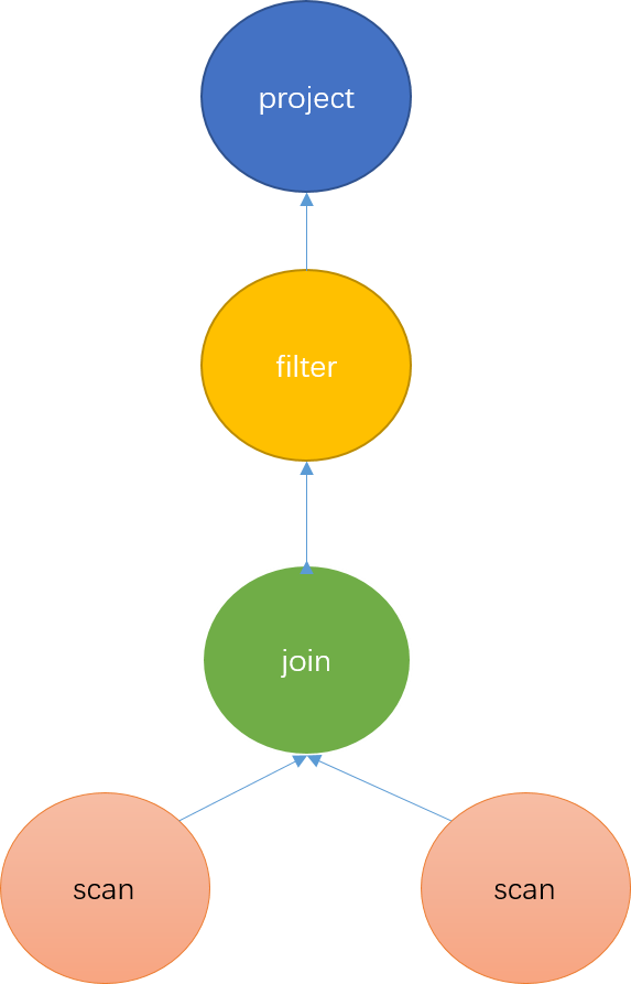 逻辑计划负责将抽象语法树转成代数关系。代数关系是一棵算子树,每个节点代表一种对数据的计算方式,整棵树代表了数据的计算方式以及流动方向,如图3所示。