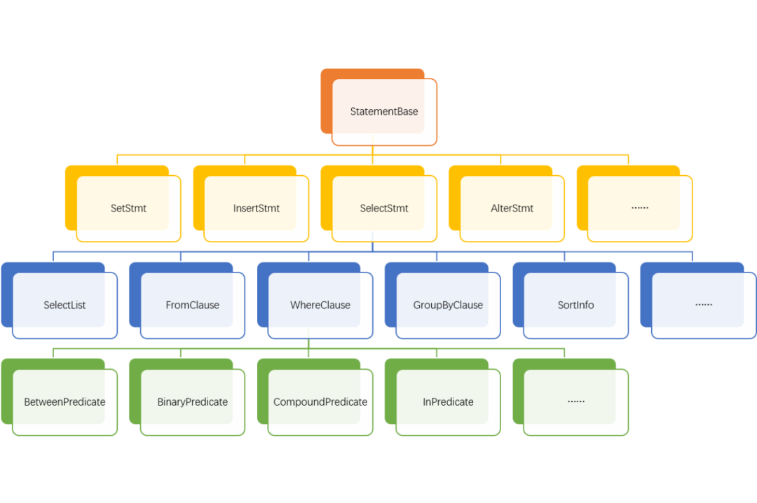 SelectStmt结构包含了SelectList,FromClause,WhereClause,GroupByClause,SortInfo等结构。这些结构又包含了更基础的一些数据结构,如WhereClause包含了BetweenPredicate(between表达式), BinaryPredicate(二元表达式), CompoundPredicate(and or组合表达式), InPredicate(in表达式)等。