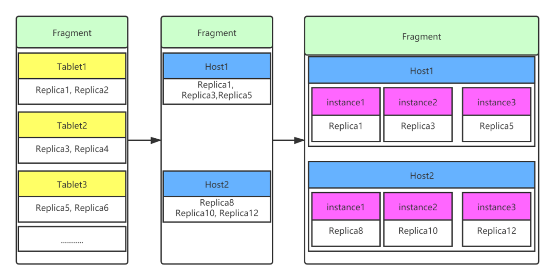 如果全局并发度设置为1时,则创建2个实例FInstanceExecParam,下发到host1和host2上去执行,如果如果全局并发度设置为3,这个host1上创建3个实例FInstanceExecParam,host2上创建3个实例FInstanceExecParam,每个实例扫描一个replica,相当于发起6个rpc请求。