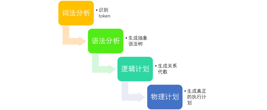 这个过程包括以下四个步骤:词法分析,语法分析,生成逻辑计划,生成物理计划。