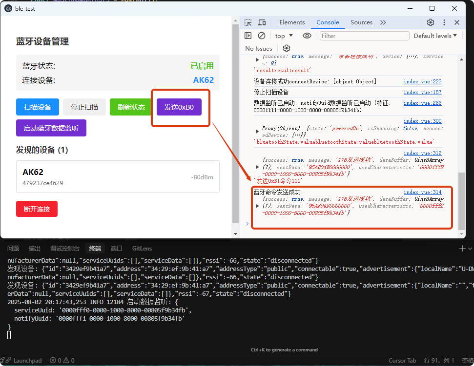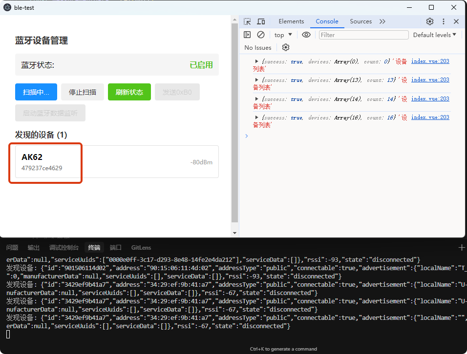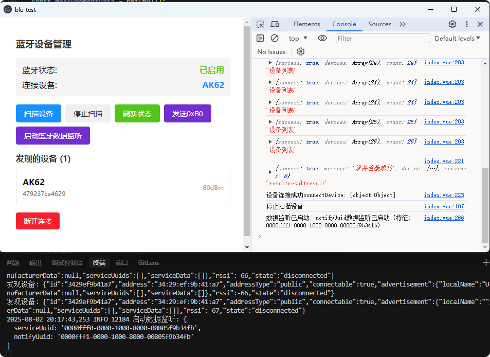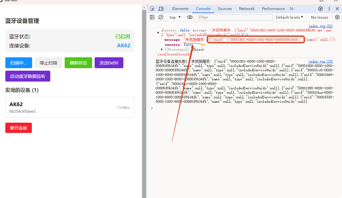 1、运行项目后Ctrl+Shift+I 打开开发者工具,点击扫描设备,等待列表出现AK62,点击连接,会报错,报错没关系,要的就是报错,报错就会有uuid,把uuid复制到index.vue的第86行SERVICE_UUID