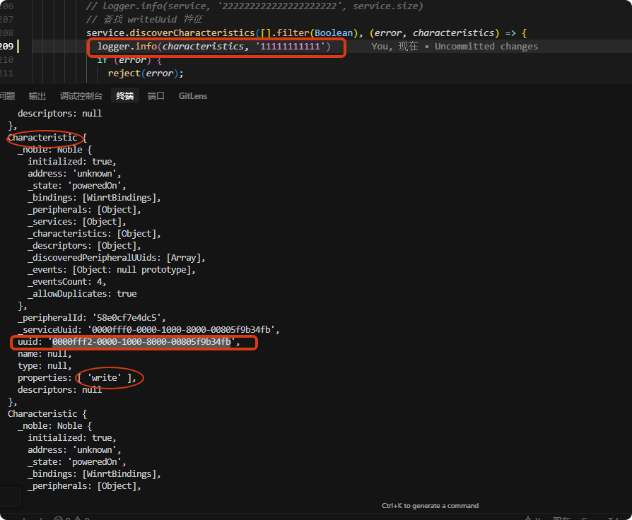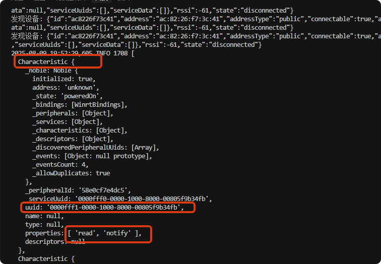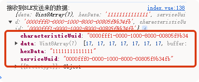2、然后重新运行项目,再扫描和连接,此时因为NOTIFY_UUID和WRITE_UUID也是我手机的特征,虽然连接成功了但是订阅不到也发送不了消息到蓝牙,这次要查看终端的控制台,找到打印消息是11111111111的日志记录,找到里面uuid有fff2的Characteristic,把fff2的替换到index.vue的第88行WRITE_UUID中