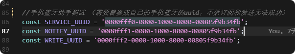 在蓝牙通信中这三个uuid是最重要的,NOTIFY_UUID负责订阅消息,WRITE_UUID负责向蓝牙设备发送消息,NOTIFY_UUID 和WRITE_UUID 是服务下的特征(Characteristic),必须归属于某个 SERVICE_UUID。