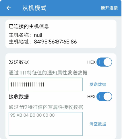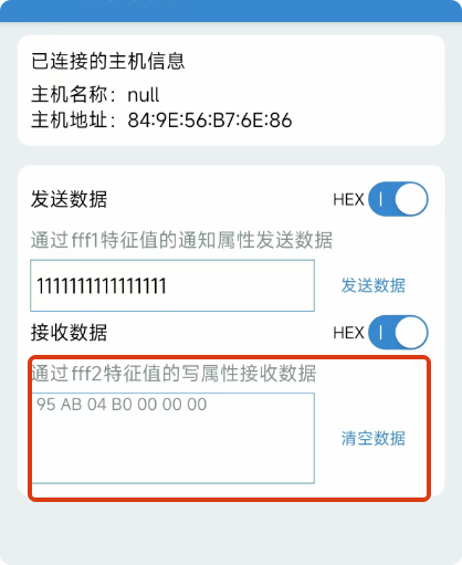 5、BLE蓝牙调试助手中会收到数据 95 AB 04B0 00 00 00