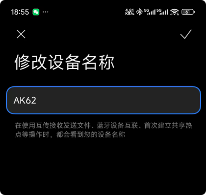 使用2个手机,都安装上面的BLE调试助手,一个手机选从机模式,另一个手机搜索连接蓝牙名AK62的从机或者是自己手机蓝牙名的从机,可以查看到fff0,fff1,fff2特征,替换到frontend 前端目录的view的indx.vue的86-89行