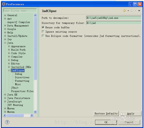 6、设置jad的可执行文件路径以及生成的临时文件路径,如图所示: