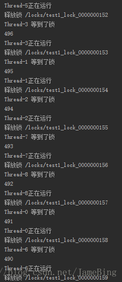 public class Test { static int n = 500; public static void secskill() { System.out.println(--n); } public static void main(String[] args) { Runnable runnable = new Runnable() { public void run() { DistributedLock lock = null; try { lock = new DistributedLock("127.0.0.1:2181", "test1"); lock.lock(); secskill(); System.out.println(Thread.currentThread().getName() + "正在运行"); } finally { if (lock != null) { lock.unlock(); } } } }; for (int i = 0; i < 10; i++) { Thread t = new Thread(runnable); t.start(); } }