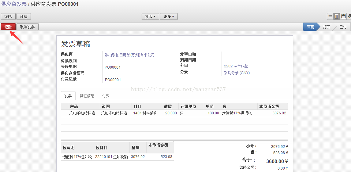点击收到的发票,可以看到发票的状态为“草稿”。生成的内部发票,会计人员可以通过菜单 [会计->供应商->供应商发票]来查询。
