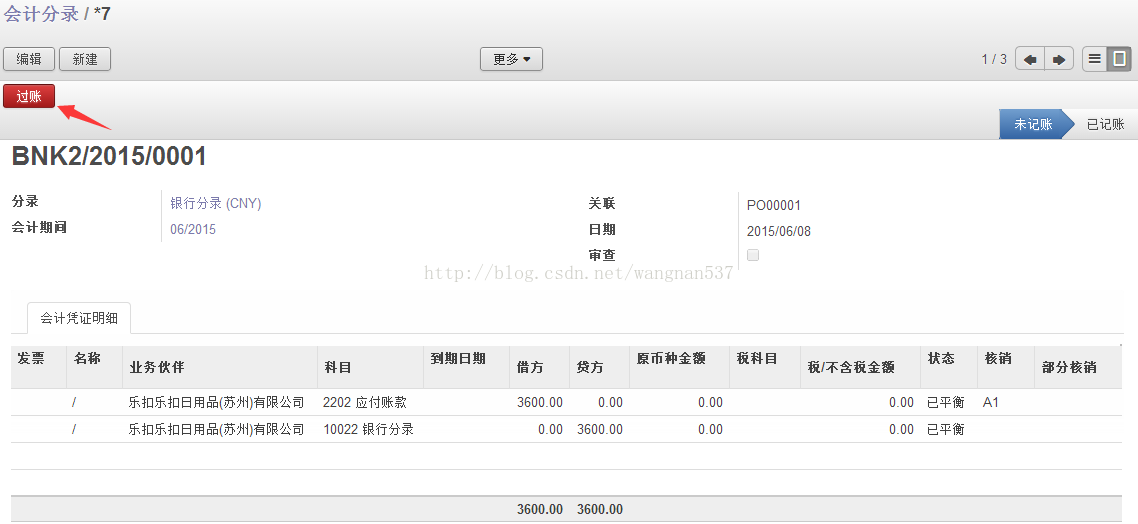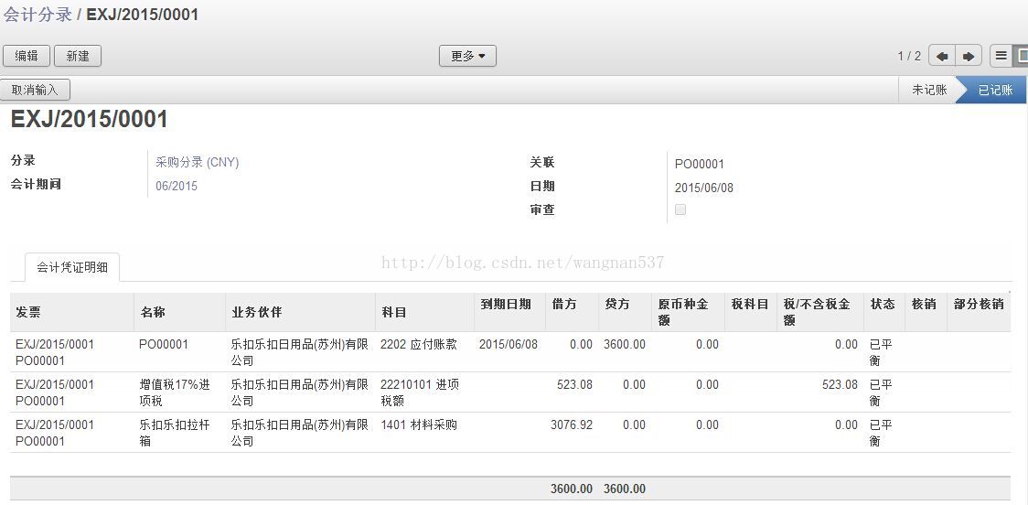 蔡文姬收到乐扣乐扣日用品(苏州)有限公司开具的实际发票后,需要与系统中之前生成的供应商发票草稿进行核对。点击菜单 [会计->供应商->供应商发票],打开发票,点击 记账,核准发票。图2.6 核准供应商发票